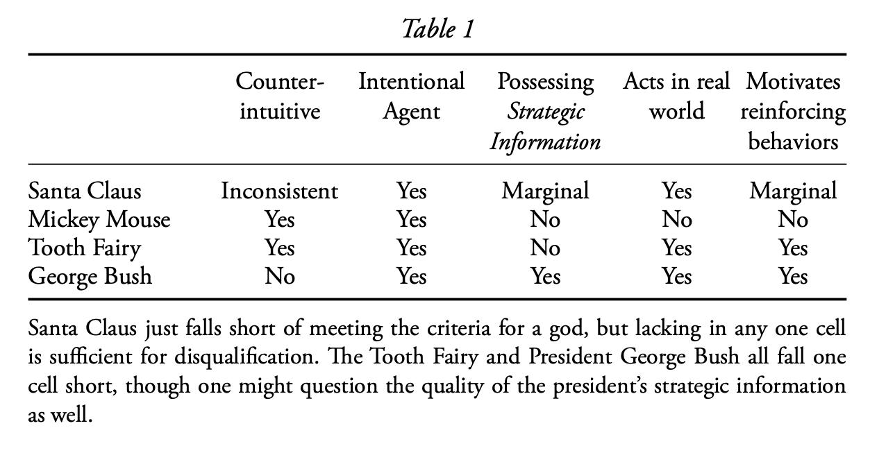 Through the lenses of cognitive science of religion, successful god concepts must possess a number of features. God concepts must be (1) counterintuitive, (2) an intentional agent, (3) possessing strategic information, (4) able to act in the human world in detectable ways and (5) capable of motivating behaviors that reinforce belief. That Santa Claus appears to be only inconsistently represented as having all five requisite features Santa has failed to develop a community of true believers and cult. Nevertheless, Santa concepts approximate a successful god concept more closely than other widespread cultural characters such as Mickey Mouse and the Tooth Fairy, in part explaining Santa's relative cultural prominence.